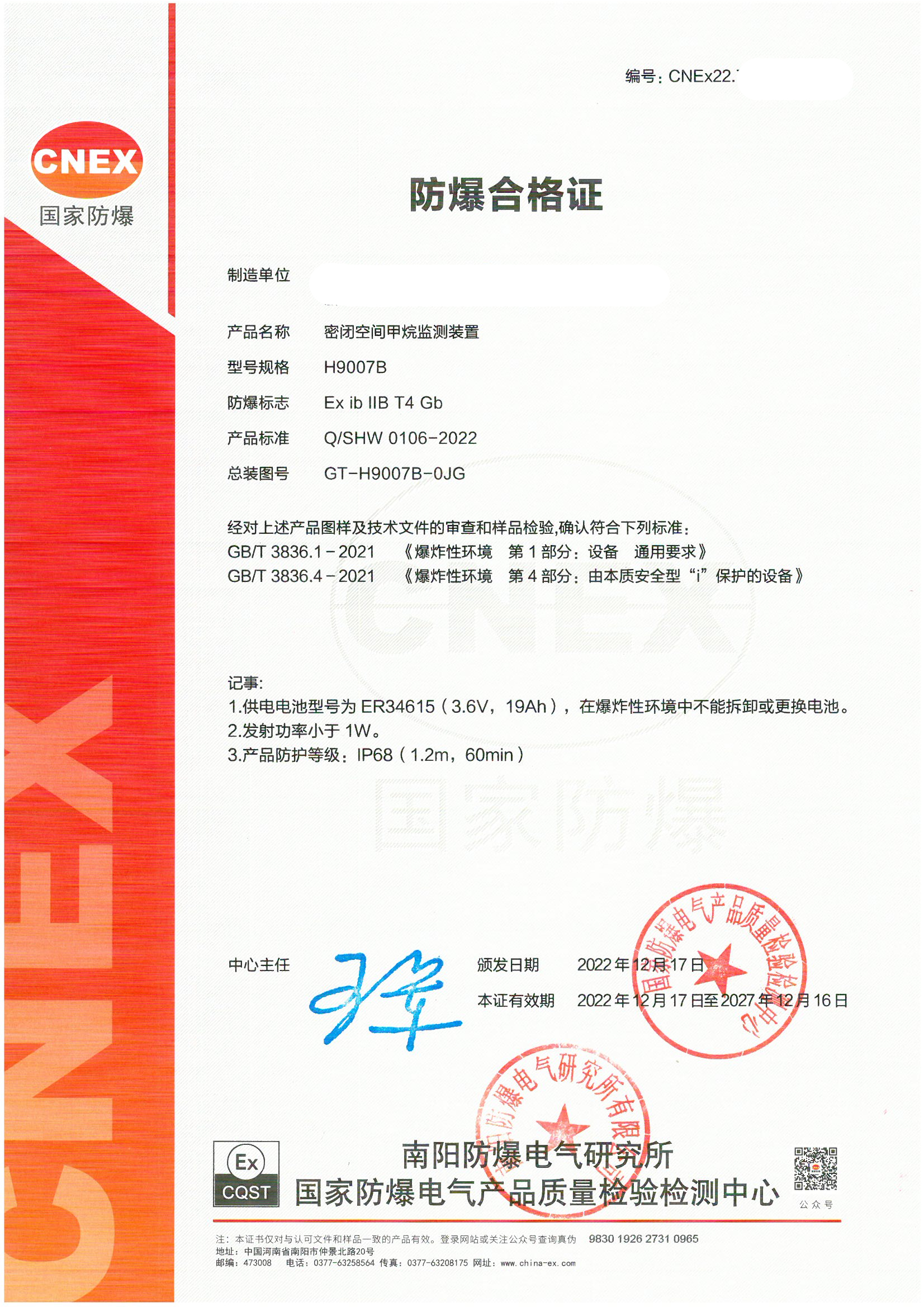 Standard requirements for obtaining an intrinsic safety explosion-proof certificate for methane monitoring devices