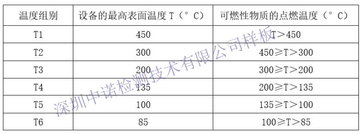 3、对于zui高表面温度超过450 °C的II类Ex设备应用摄氏温度来标记zui高表面温度,例如, 600 °C。