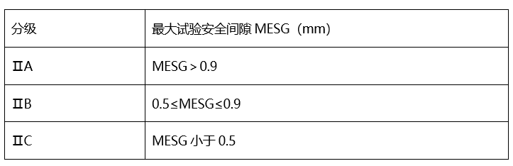 Ⅱ类隔爆型电气设备根据zui大试验安 全间隙MESGmm)分为IIA、IIB、IIC三个等级: